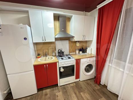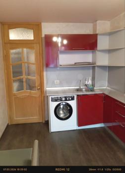 Kухня оборудована современной техникой: установлена плита, есть холодильник и стиральная машина. В комнате имеется шкаф и диван, что обеспечивает комфортное проживание. Санузлы раздельные, что добавляет удобства.