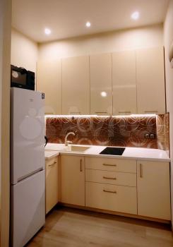 Кухня оборудована современной встроенной техникой. Санузел совмещенный, выполнен в светлых тонах с качественной отделкой.