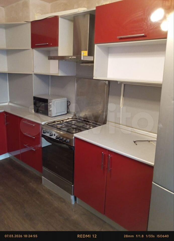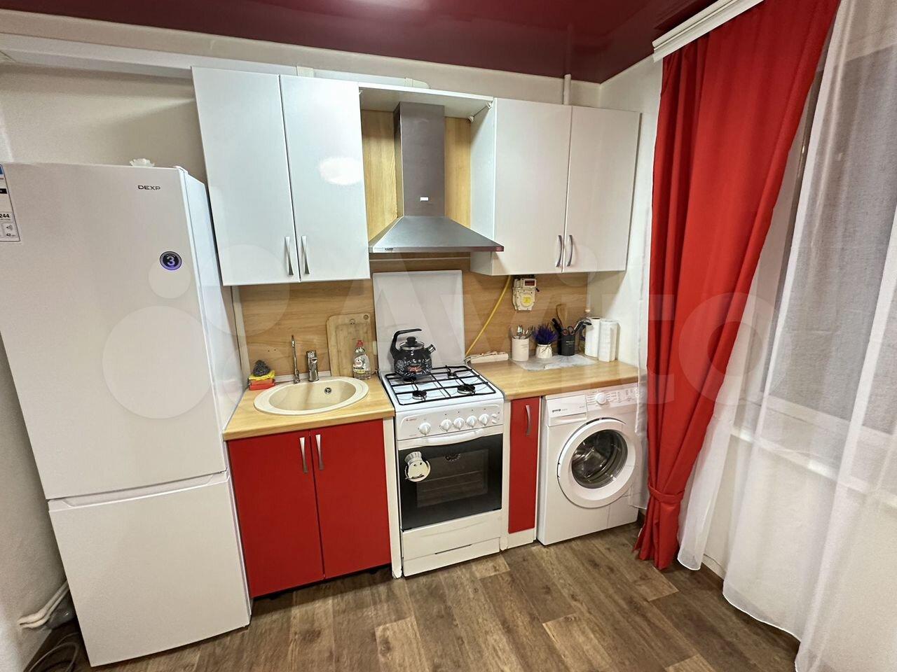 Kухня оборудована современной техникой: установлена плита, есть холодильник и стиральная машина. В комнате имеется шкаф и диван, что обеспечивает комфортное проживание. Санузлы раздельные, что добавляет удобства.