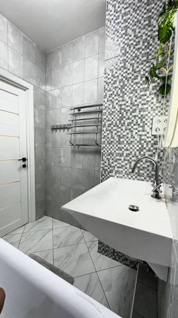 Техника: 2 кондиционера, микроволновая печь, духовой шкаф электрический, газовая стеклокерамическая варочная поверхность, вытяжка, пылесос, стиральная машина с сушкой, титан, телевизор, холодильник, чайник, утюг,