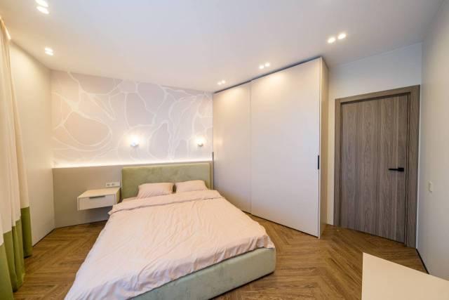 Мебель: Двуспальная кровать, Диван, современный Кухонный гарнитур, Обеденный стол, вместительный Шкаф-купе, вся мебель подобрана в едином стиле и гармонично дополняет интерьер.