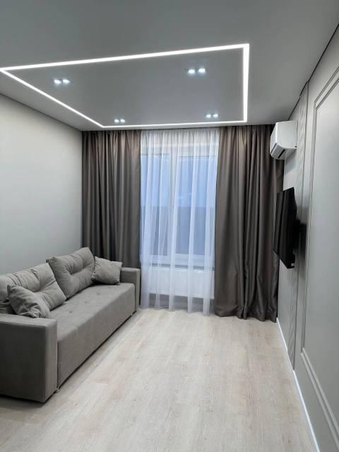 Квартира с евроремонтом, выполненным с использованием качественных материалов. В комнате есть вся необходимая мебель и техника: кондиционер, телевизор, стиральная машина и диван со спальным местом. На данный момент в квартире нет холодильника, его привезут в конце января. А также, в спальне нет кровати, она планируется к покупке.