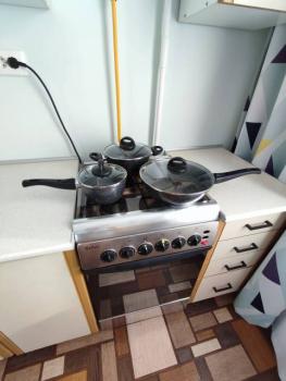 санузел - совмещённый, мебель - кухня, хранение одежды, спальные места, кондиционер, холодильник, плита, стиральная машина.