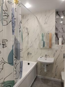 В квартире есть всё необходимое для проживания. Много места для хранения вещей. Техника и мебель вся новая: в спальне кровать с ортопедическим матрасом и подъемным механизмом для хранения вещей, вместительный распашной шкаф, подвесные прикроватные тумбы; в кухне-гостинной установлен кухонный гарнитур с периметральной сенсорной подсветкой, холодильник, СВЧ, электроплита, духовой шкаф, вытяжка, кондиционер, питьевая вода (трехступенчатая защита от хлора, механических частиц, тяжелых металлов, запахов, привкусов), комфортный диванчик, раздвижной стол, удобные стулья; в коридоре большой встроенный шкаф и большое зеркало; санузел оснащен коллекторной разводкой системы водоснабжения, предусматривающей фильтрацию воды, защиту от гидроудара, равномерность распределения воды, защиту от протечек с помощью датчиков и системы Нептун, удобство эксплуатации и возможность перекрытия отдельных узлов. Установлена качественная сантехника – подвесная инсталляция с системой смыва «Торнадо», большая ванна, тропический душ, встроенная в потолок шторка, зеркало с подсветкой, подвесная раковина, стиральная машинка-автомат, бойлер, электрический полотенцесушитель; просторная лоджия с большим подоконником и удобным стеллажом.