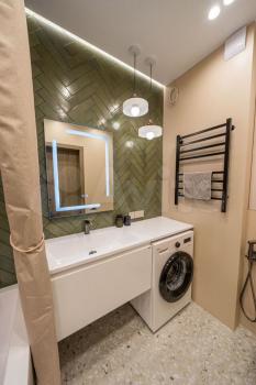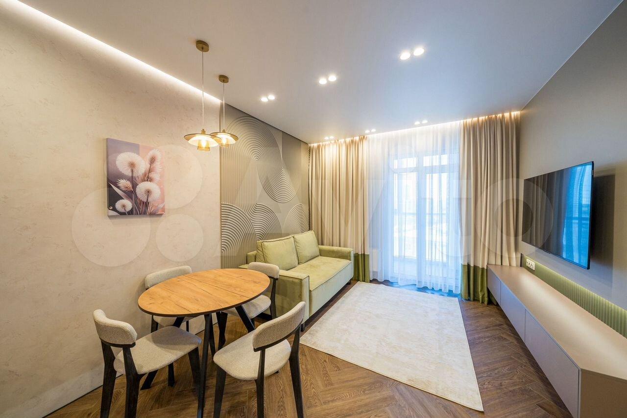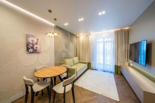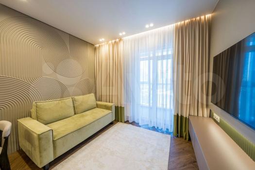 Квартира с евроремонтом, выполненным с использованием качественных материалов. В комнате есть вся необходимая мебель и техника: кондиционер, телевизор, стиральная машина и диван со спальным местом. На данный момент в квартире нет холодильника, его привезут в конце января. А также, в спальне нет кровати, она планируется к покупке.