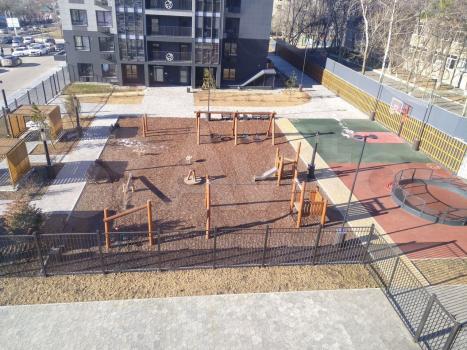 Дом расположен в закрытой территории с парковкой за шлагбаумом. Для удобства жильцов предусмотрен пассажирский лифт. Во дворе есть спортивная площадка.