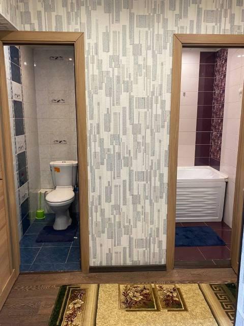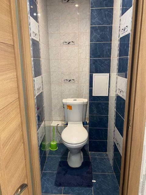 Туалет совмещен с душевой комнатой (просторная, вместится детская ванночка), унитаз подвесной, встроенная раковина с тумбой, зеркалом с подсветкой, смесители Grohe, водонагреватель на 60л обеспечивает горячую воду одновременно в санузле и на кухне. Теплый пол в туалете.