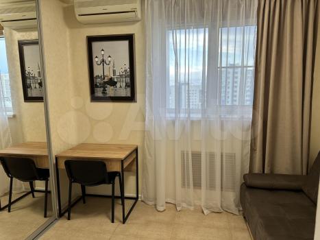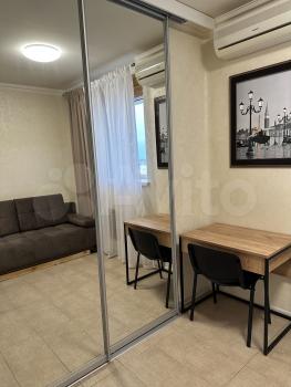 Внутри огороженного двора имеется открытая парковка. Квартира состоит из двух комнат. Одна из которых небольшой кабинет, а вторая просторная гостиная с зонированной спальней и кухней. Квартира укомплектована всей необходимой для проживания мебелью и техникой.