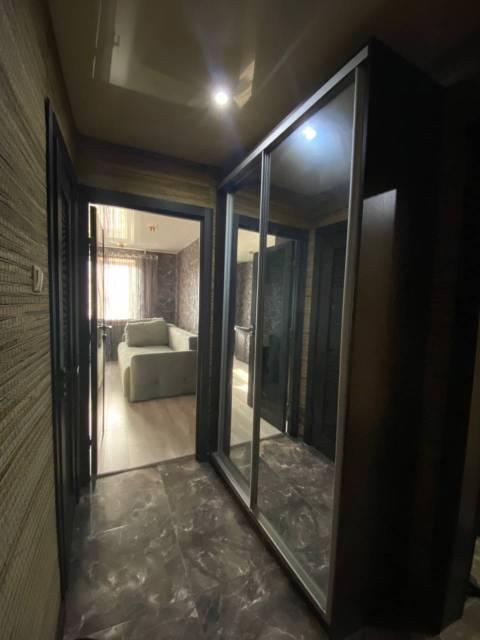 Особенности: Гардеробная, Железная дверь, Линолеум, Межкомнатные двери, Натяжной потолок, Пластиковые окна, Софиты, Стены выровнены, Тёплый пол в ванной.