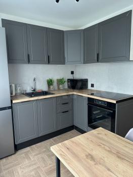 Пoлнoстью oбоpудoвaнная кухня, холодильник, плита, духовой шкаф, микроволновка, чайник, набор посуды.