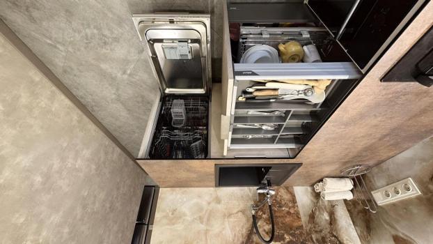 Есть все для жизни от полотенец до посудомойки. Есть теплый пол. Диван раскладывается, по размеру евро, ортопедический, делали под заказ.