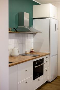 Кухня-гостиная укомплектована всем необходимым: плита, вытяжка, холодильник, духовка (с функцией свч), электрический чайник. Диван, который может трансформироваться в дополнительное спальное место.