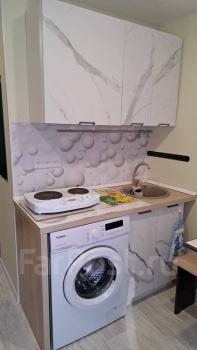 Диван,холодильник, микроволновая печь,плита,стиральная машина,гладильная доска,сушилка,шкаф для одежды,кухонный гарнитур,небольшая прихожая.