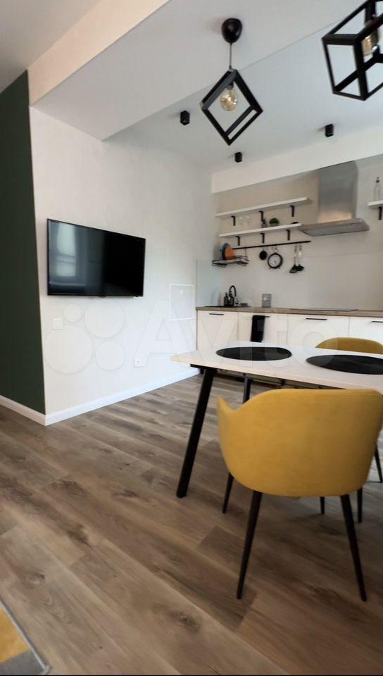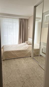 Квартира полностью готова для комфортного проживания. В комнате и на кухне имеется вся необходимая мебель. Для вашего удобства установлены кондиционер, холодильник и стиральная машина. Санузел совмещённый и оснащён ванной, что делает его особенно удобным для релаксации после тяжелого дня.