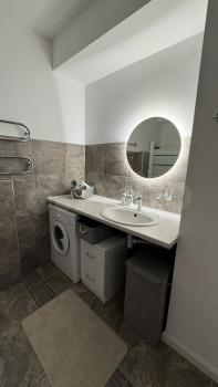 -Санузел отделанный кафельной плиткой, установлена стиральная машинка, полотенцесушитель.