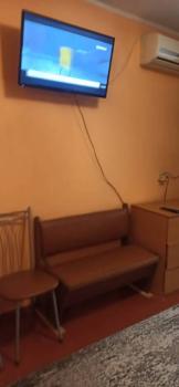 - в комнате представлена односпальная кровать, стол, стул, табурет, вешалка для одежды, кондиционер